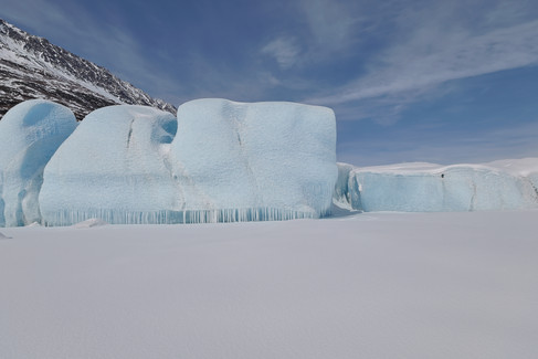 The glacier was still covered with a layer of snow, which makes landing on the glacier itself not advisable. So we flew past to the far side and into the toe of the glacier. Here the water was frozen solid with icebergs sticking out from the frozen ice now covered with snow.
