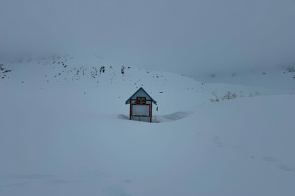 Having had our fill, we then made our way pass Fish Hook and up to Hatcher Pass. The road to Hatcher Pass was closed as it was filled with snow. We reached the the Hatcher Pass Lodge with its bright red buildings, but Independence Bowl was socked in and completely white out.