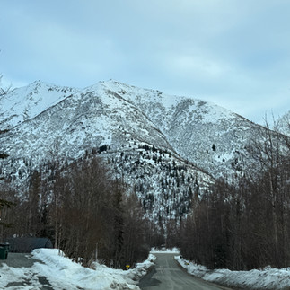 We then drove down the coast line and back towards the mountains as Chugach was calling. We made our way into a nearby suburb called Hillside. Here the homes were large and nestled on the hillside overlooking Anchorage. At the back of this subdivision was a hiking area called Flattop Mountain. We decided to do a short hike - which turned out to be not so short as the conditions were quite challenging to begin with. The snow line was thick and icy conditions prevailed. We had difficulty with some parts as the trail was not very clear and there were many confusing pathways made by hikers, skiers and snow machines. We got a little off trail and picked a path less traveled. This resulted in spots where the trail looked firm but it was not. The snow beneath had melted, causing us to knee-deep post hole several times along the way. Climbing out of these was a bit challenging; but the views made it all worthwhile!