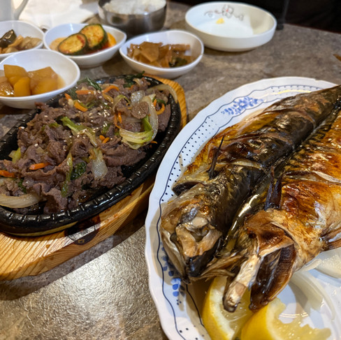 This evening after our good workout uphill, we decided to have a late dinner at an authentic Korean Restaurant called Home Town. Here we had the grilled mackerel and bulgogi. We were stuffed!