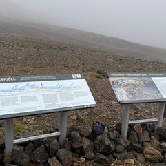 Having been couped up for all morning we decided to brave the weather and took a drive out to the Kies Parking lot. This location has two hiking trailheads to reach the high peaks of Kerlingarfjoll (FANNBORG, VESTURGNÝPA, SNÆKOLLUR, SNÓT AND LOÐMUNDUR). The drive up the mountain was definitely different from the day before, with much more water on the road and greater sliding from the mud. Soon we arrived at Kastali House; an old skiing hut for the winter to access the slopes of Fannborg. Inside the house it was adorned with old skis and pictures from long bygone adventures. There was also a collection of andesite rocks collected from around the mountains here. Nonetheless, it was clean and dry, versus the wet fog and rain with sideways wind outside.